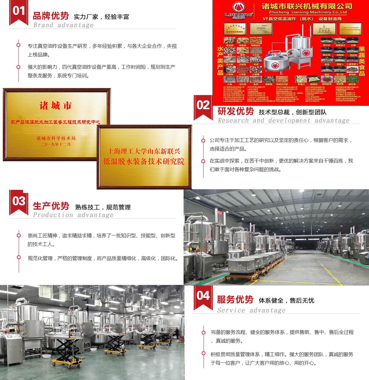 聯(lián)興第四代真空低溫油炸機顛覆了傳統(tǒng)意義上的真空油炸機工作時間長、工作效率低的概念。我公司通過大量客戶使用反饋,將設(shè)備進行改造升級,同等型號同等設(shè)備較傳統(tǒng)意義上的真空油炸機工作效率提高了30%,且我公司每臺設(shè)備零部件均有存檔,方便為客戶提供便捷迅速的售后服務(wù)。